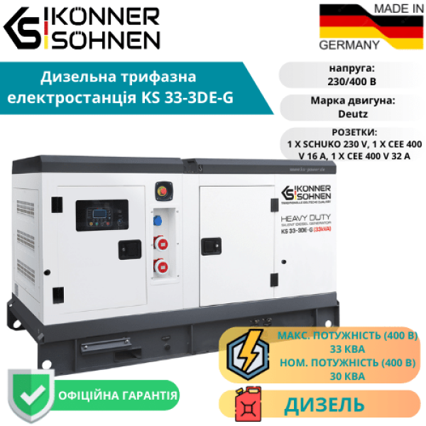 Дизельна трифазна електростанція KS 33-3DE-G від Könner & Söhnen - це потужний і надійний джерело живлення з наступними характеристиками та особливостями: