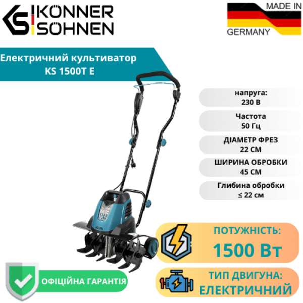 Потужність двигуна в моделі KS 1500T E складає 1500 Вт, діаметр фрез – 22 см. До складу комплекту електричного культиватора додано транспортувальні колеса.