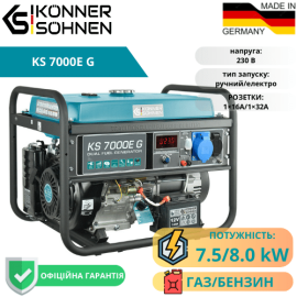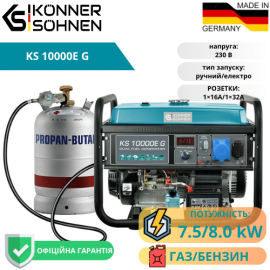 Пропонуємо вашій увазі гібридні генератори німецького бренду Könner&Söhnen для побутового і промислового застосування. Популярні моделі газобензинових генераторів: KS 2900G, KS 3000G, KS 5000E G, KS 7000E G, KS 9000E G, KS 10000E G. В якості палива можна використовувати і бензин, і зріджений газ (пропан-бутан). Переключення між різними видами палива відбувається максимально просто та швидко.