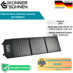Портативна сонячна панель KS SP60W-3 від німецького виробника Könner & Söhnen - це надійний і зручний спосіб заряджати ваші пристрої завдяки сонячній енергії. За допомогою цієї сонячної панелі ви зможете легко заряджати мобільні телефони, планшети, GPS, павербанки та інші пристрої, навіть коли ви знаходитесь подалі від джерела живлення.